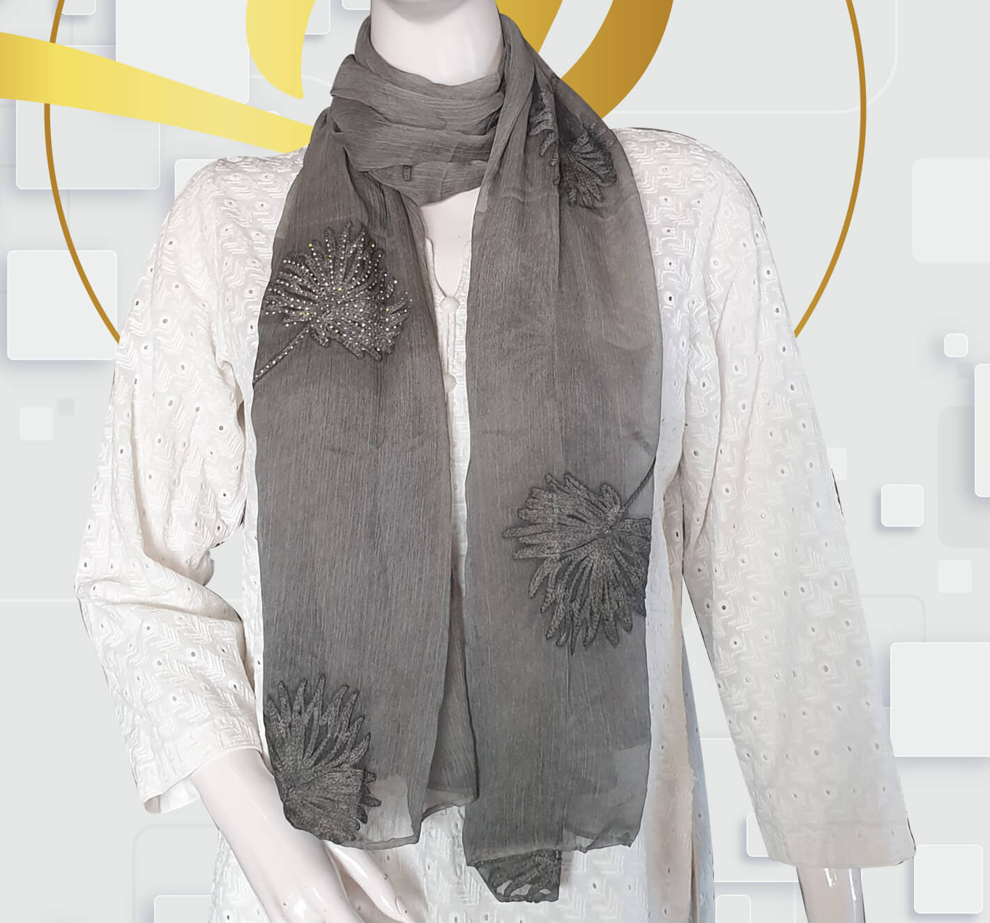 The premium crinkle chiffon scarf features a luxuriously smooth, light-weight fabric, floral embroidery with minimal embellishment, providing a sophisticated and classic finish to any hijab style.