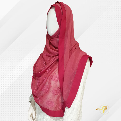 Our Magenta premium chiffon scarf features a swirl embroidered pattern on half of the surface with a plain border. The fabric is a nonslip breathable material with a natural shine that makes the hijab a perfect fit for classic Eid looks.